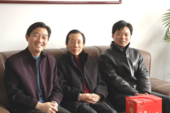 董事長楊揚(yáng)與副董事長兼縱橫國際董事長陳照東、縱橫國際總經(jīng)理凌衛(wèi)國在慰問時合影
