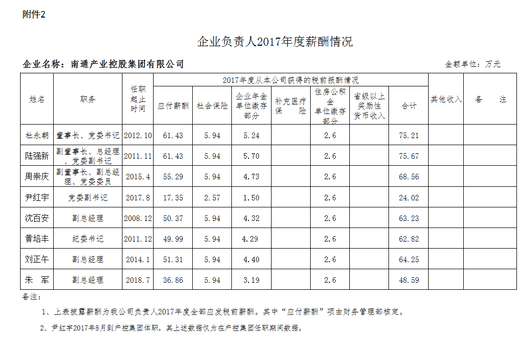 南通產業(yè)控股集團有限公司2017年度薪酬信息披露公告