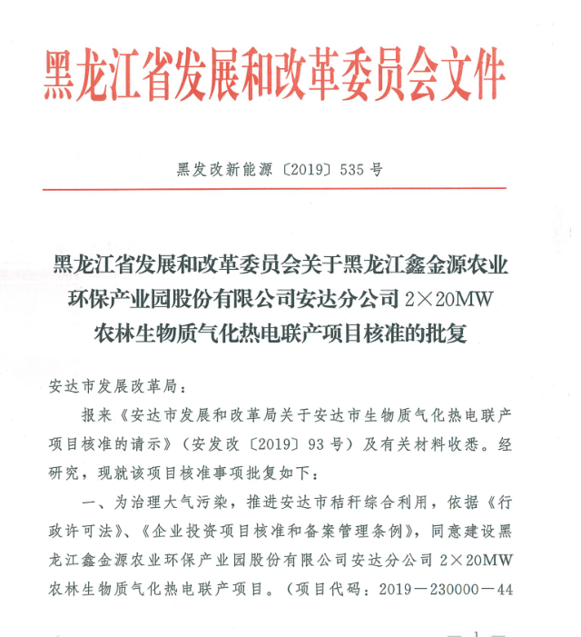 安達2×20MW農林生物質氣化熱電聯(lián)產項目 獲黑龍江省發(fā)改委核準
