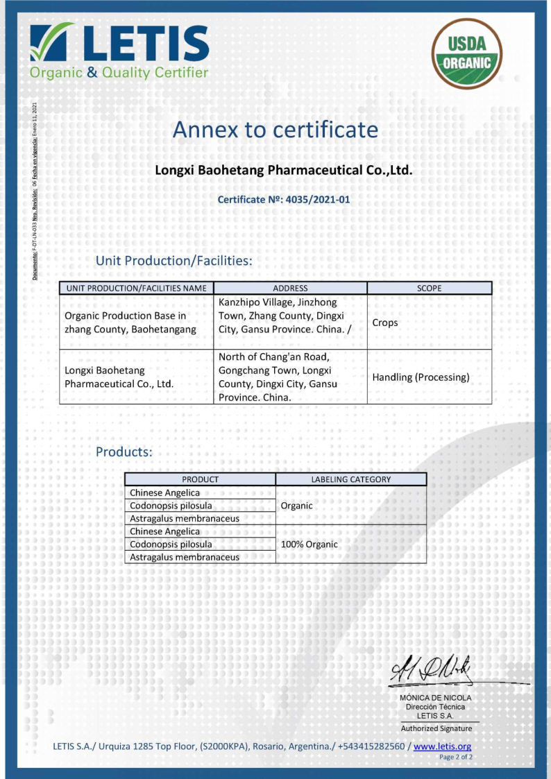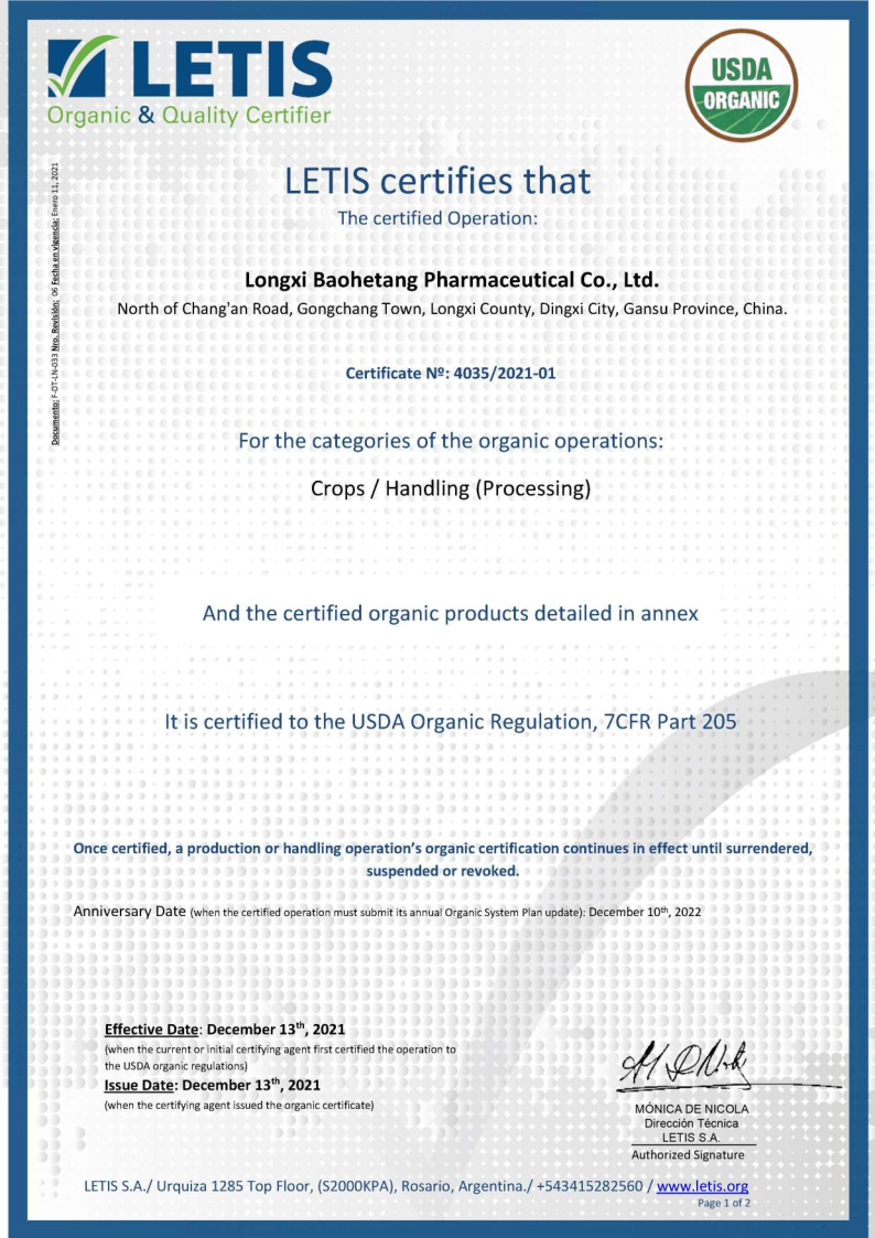 自2017年開始,隴西保和堂在推動(dòng)道地有機(jī)種植基地建設(shè)、有機(jī)產(chǎn)品加工等方面不斷發(fā)力,先后于2019年12月獲得隴西、岷縣、漳縣、渭源、宕昌5個(gè)種植基地的《有機(jī)轉(zhuǎn)換認(rèn)證證書》,2020年12月獲得當(dāng)歸、黨參、黃芪的《有機(jī)產(chǎn)品認(rèn)證證書》,2021年7月獲得當(dāng)歸、黨參、黃芪生產(chǎn)加工《有機(jī)產(chǎn)品認(rèn)證證書》,并成功申請(qǐng)了產(chǎn)品有機(jī)標(biāo)簽。 公司從種子種苗繁育、土壤改良、種植基地建設(shè)、田間管理標(biāo)準(zhǔn)化、采挖加工等一系列環(huán)節(jié)入手,層層把關(guān),厲行標(biāo)準(zhǔn)化有機(jī)種植基地建設(shè)和車間加工建設(shè),實(shí)現(xiàn)了產(chǎn)品“來源可知,去向可追,過程可控,責(zé)任可究”,真正走出了一條產(chǎn)業(yè)優(yōu)、質(zhì)量高、可持續(xù)的發(fā)展新路子。此次美國NOP認(rèn)證證書的取得,為公司進(jìn)一步走向國際市場打下了堅(jiān)定的基礎(chǔ)。我們堅(jiān)信隨著公司產(chǎn)品品質(zhì)和知名度的不斷提升,“隴西保和堂”品牌產(chǎn)品會(huì)受到越來越多客戶的推崇和信賴。