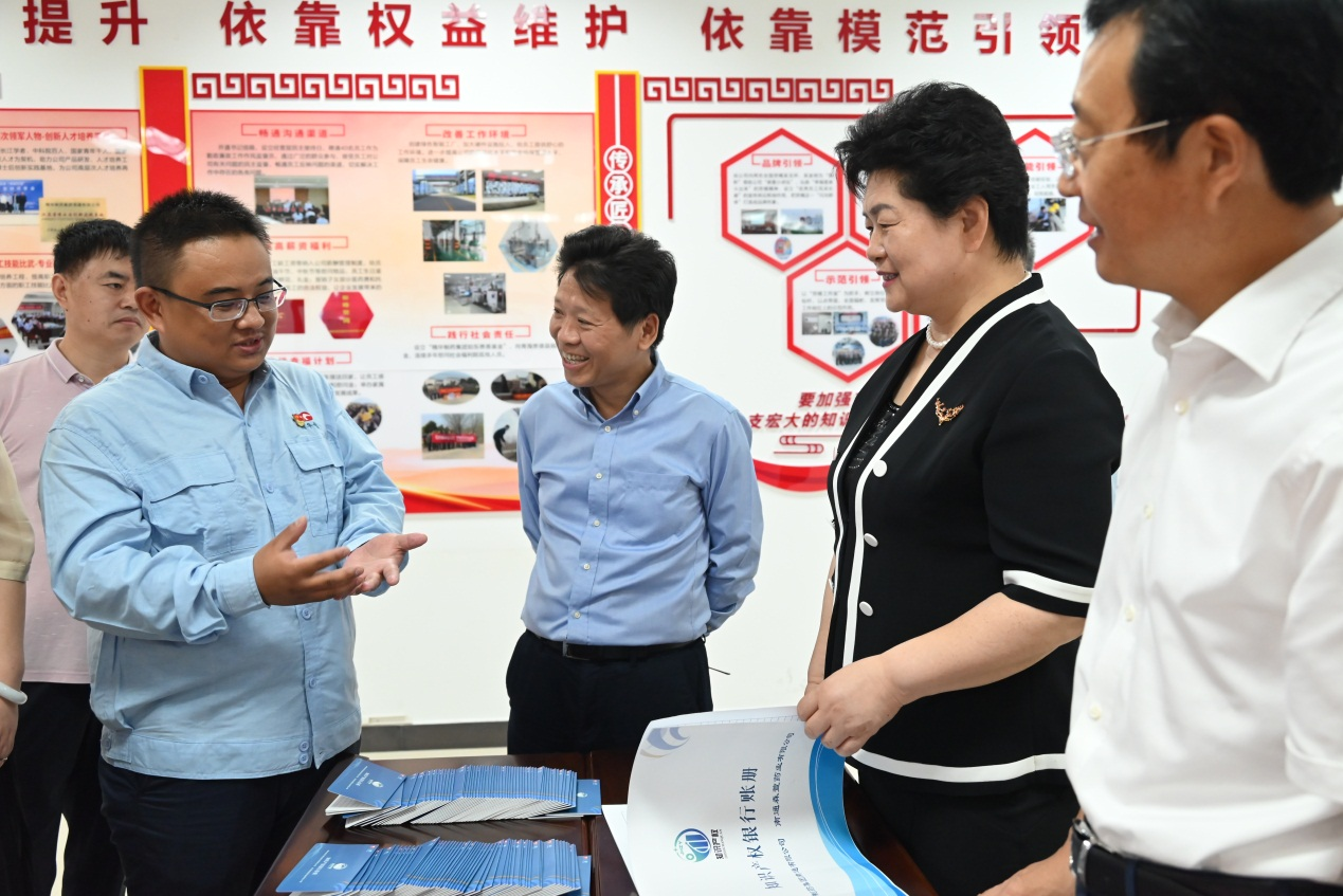 公司董事長、總經(jīng)理袁擁軍代表公司全體員工對蔡毅德一行表示熱烈的歡迎,并陪同參觀了公司黨群活動室、產(chǎn)改工作室,詳細介紹了在公司“五彩黨建”引領(lǐng)下,以“五個依靠、五心工程”為抓手開展的一系列產(chǎn)改工作。袁擁軍匯報了公司近年來在黨建工作、生產(chǎn)經(jīng)營、科技創(chuàng)新、人才培養(yǎng)、產(chǎn)業(yè)工人改革等方面取得的優(yōu)異成績。調(diào)研過程中,來訪人員饒有興趣的了解了公司 “員工幸福計劃”、“知識產(chǎn)權(quán)銀行”制度、“青藍工程”等亮點工作和做法,并給予高度肯定。袁擁軍向來訪人員贈送了由公司黨員和管理骨干開展讀書征文活動編撰的 “單位如家、感恩有我”、“奮斗如歌”、“責任如磐、攻堅有我”系列叢書。