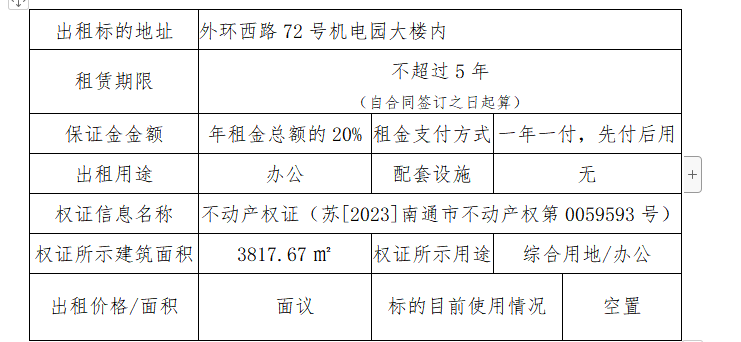 南通國泰創(chuàng)業(yè)投資有限公司所托管園區(qū)外環(huán)西路72號機電園,已由南通三玖企業(yè)管理服務有限公司中標負責整體招商運營管理,擬打造成“產(chǎn)業(yè)研發(fā)、辦公及配套商業(yè)”的總體格局,即日起公開對外招租。 一、出租標的信息